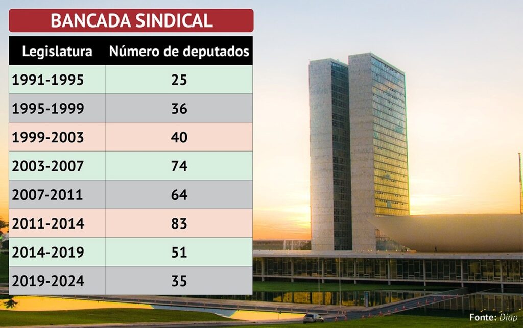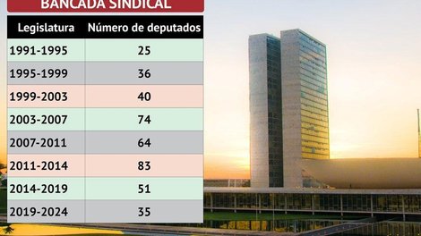 Na atual legislatura, a chamada bancada sindical na Câmara perdeu praticamente um terço de sua representação. O número caiu de 51 para 35 deputados, sendo 27 reeleitos e oito novos. No período 2011-2014, no primeiro governo Dilma, o total chegou a ser de 83, segundo acompanhamento feito pelo Departamento Intersindical de Assessoria Parlamentar (Diap). A bancada empresarial na Câmara, nesta legislatura, é quase seis vezes maior.