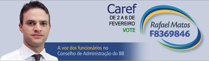 O Sindicato dos Bancários de Brasília apoia a reeleição de Rafael Vieira de Mato (matrícula F8369846), a exemplo da Contraf-CUT e da grande maioria das federações e dos sindicatos a ela filiados em todo o Brasil. Rafael já provou ter as melhores condições para levar até a alta direção do BB a voz do funcionalismo e defender no colegiado de decisões estratégicas do banco a visão dos funcionários.