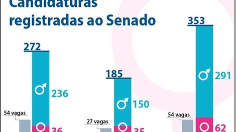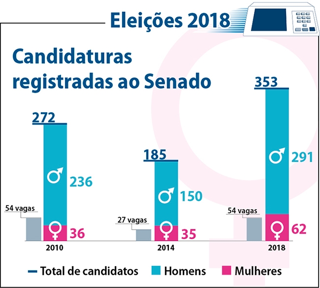 Apesar do crescimento do número de mulheres, a participação feminina ainda é pequena se comparado com o número de homens que concorrem ao Senado. No total, 353 candidatos buscam assento na Casa. Desses, 291 são homens, o que representa 82,4% das candidaturas, contra 17,6% do gênero feminino. A proporção mudou pouco desde 2010, quando 86,8% dos candidatos eram homens e 13,2% mulheres.