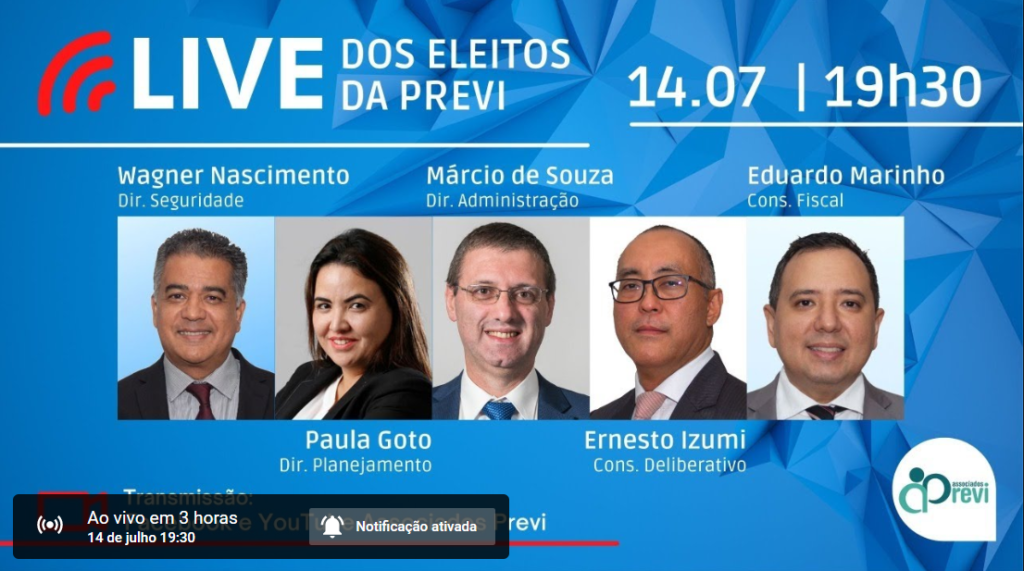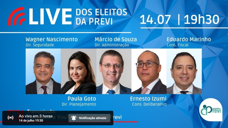 A transmissão tem início às 19h30 pelos canais Associados Previ no YouTube e no Facebook. Para acompanhar, acesse https://www.youtube.com/watch?v=01Dy1jMzFyk.