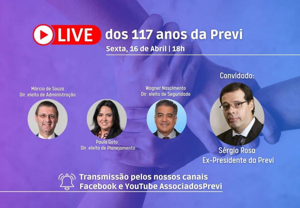 Os diretores eleitos fazem nesta sexta-feira (16), às 18h00, uma live especial para comemorar o 117º aniversário da Previ e conversar com os associados sobre os últimos acontecimentos, como o resultado dos planos, a implantação do novo regulamento do Plano 1, o convênio com o INSS e a suspensão do Empréstimo Simples. Terá transmissão ao vivo nos canais dos Associados Previ no Facebook e no Youtube.