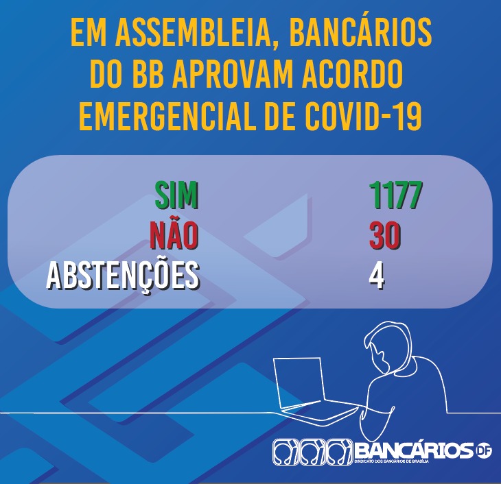 Os bancários do Banco do Brasil em Brasília aprovaram em assembleia remota realizada ao longo desta quarta-feira (10) pelo portal do Sindicato a proposta de prorrogação do chamado acordo emergencial de covid-19, com validade de dois anos.