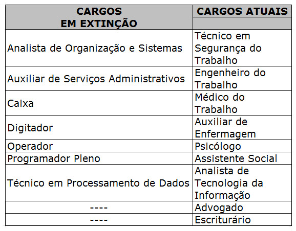 Para os cargos em extinção será mantida a descontinuidade de sua ocupação, sem prejuízo aos empregados que estão em exercício, que ficarão no respectivo cargo, sendo que a vaga somente será extinta com saída desses empregados.