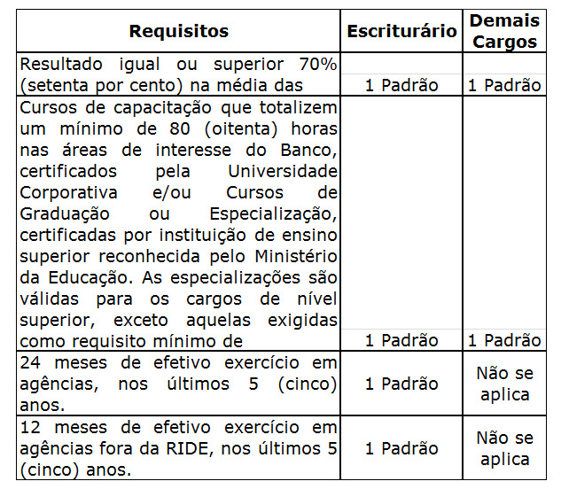 A revisão do PCCR não alterou os critérios para a promoção e progressões. Assim, os empregados do BRB continuarão a ter as seguintes possibilidades de promoção e de progressão: (a) Progressão funcional: é a elevação do salário do empregado para o padrão salarial imediatamente superior dentro da classe salarial do seu cargo. Poderá ocorrer por antiguidade e/ou merecimento. A progressão por antiguidade será anual e contemplará todos os empregados. A progressão por merecimento ocorrerá no interstício de 24 meses e dependerá do preenchimento dos requisitos estabelecidos no plano; e, (b) Promoção: é a passagem do empregado enquadrado no último padrão salarial da classe salarial em que está posicionado para a classe salarial imediatamente superior, mediante critérios definidos no Parágrafo Único.