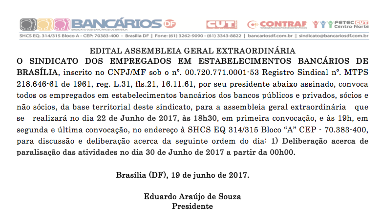 Nesta quinta-feira (22) e no próximo dia 27, bancários e bancárias participarão de assembleias deliberativas sobre a Greve Geral que irá parar o país no dia 30 de junho. Elas acontecerão no mesmo horário, às 19h, na sede do Sindicato (EQS 314/315).