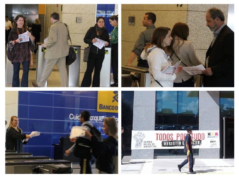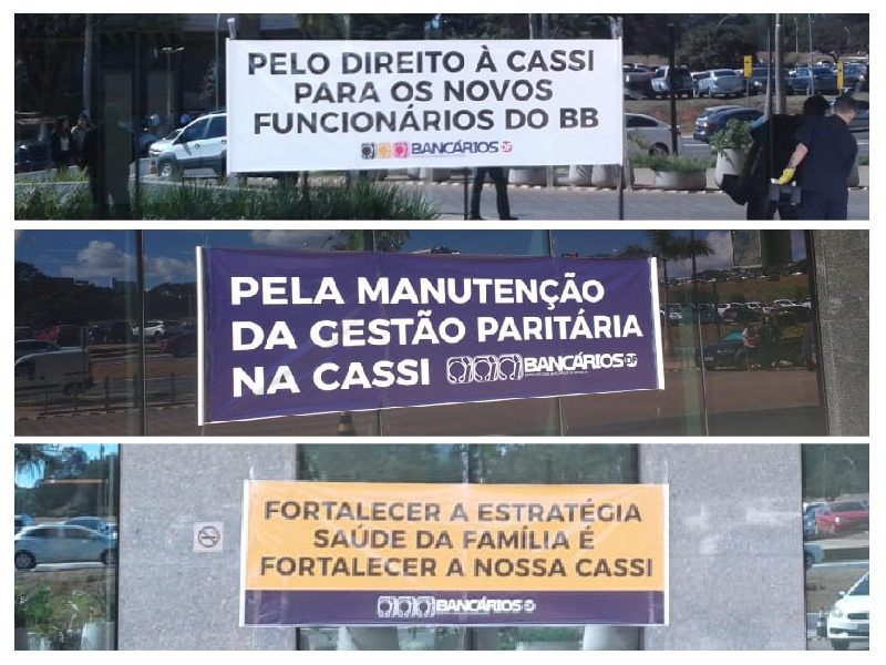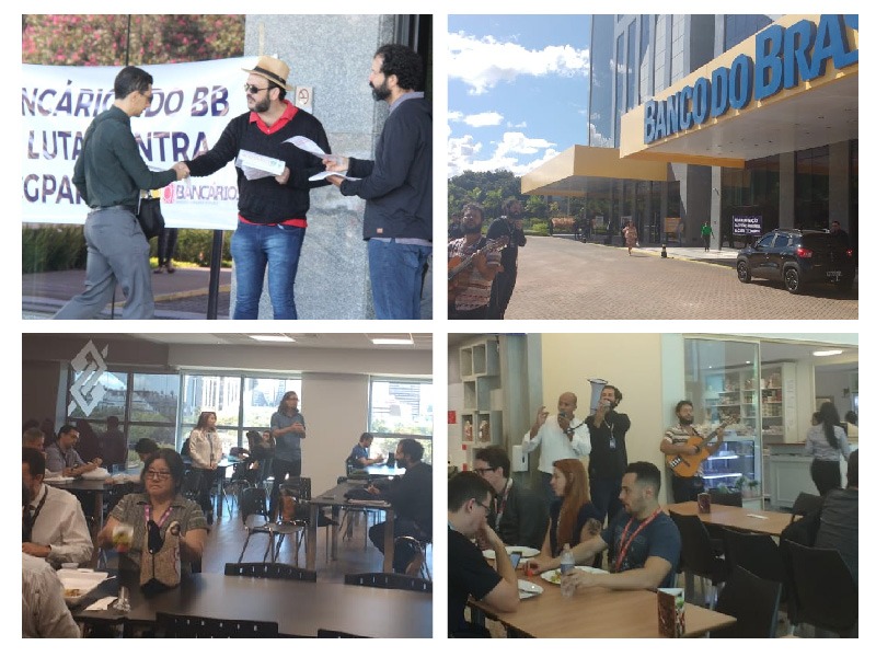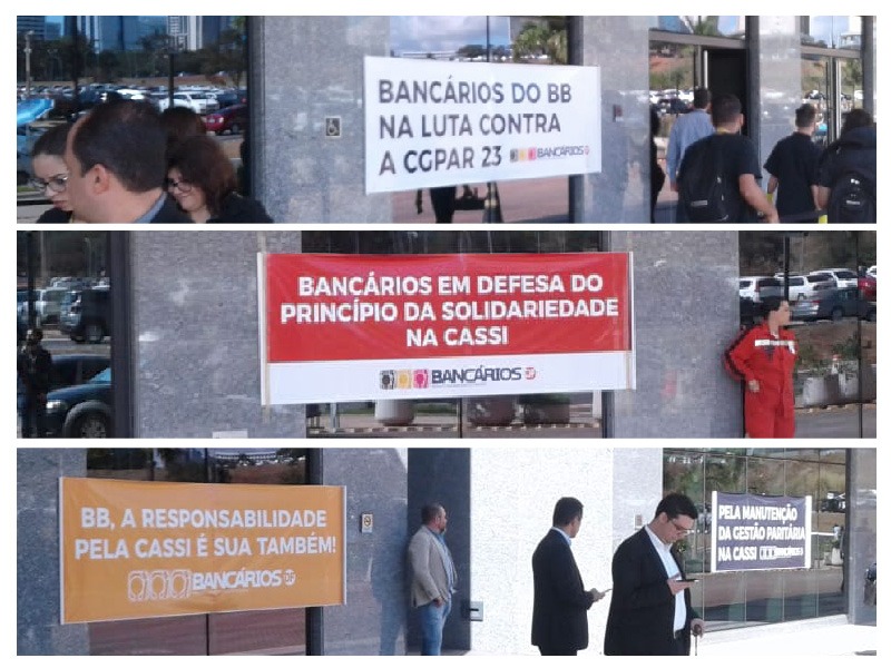Em Brasília, diretores do Sindicato espalharam faixas pelo prédio do Banco do Brasil da 201 Norte e fizeram a distribuição do Espelho DF (publicação dirigida ao funcionalismo do BB), além de reuniões nos espaços de convivências e nos refeitórios laterais do térreo para debater com os funcionários o retrocesso que significa a proposta apresentada pelo banco para o plano de saúde dos bancários.