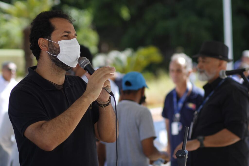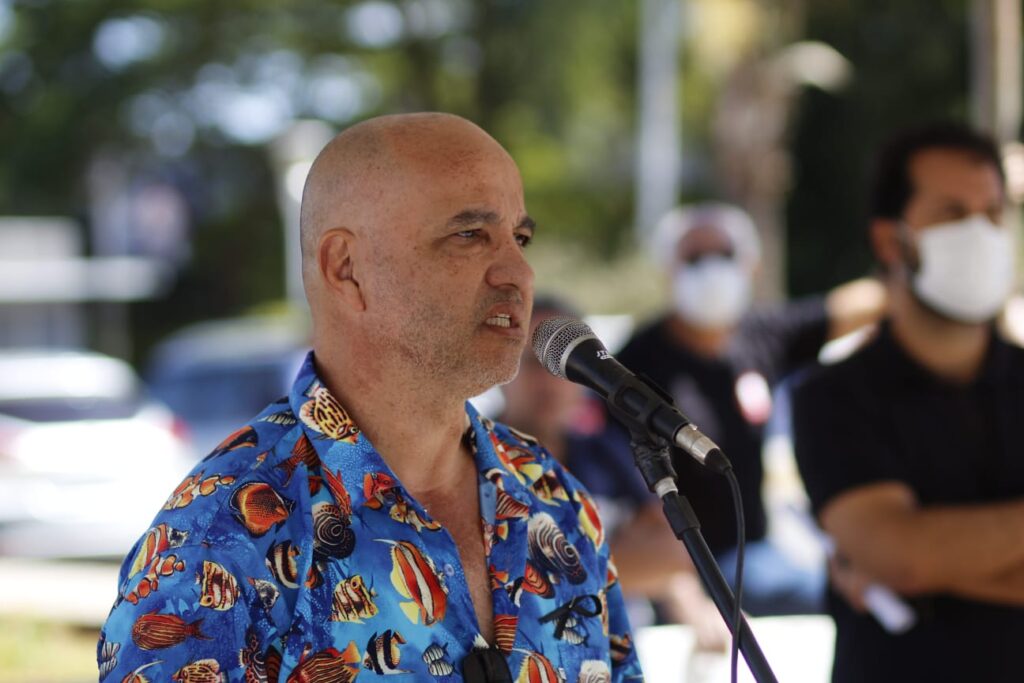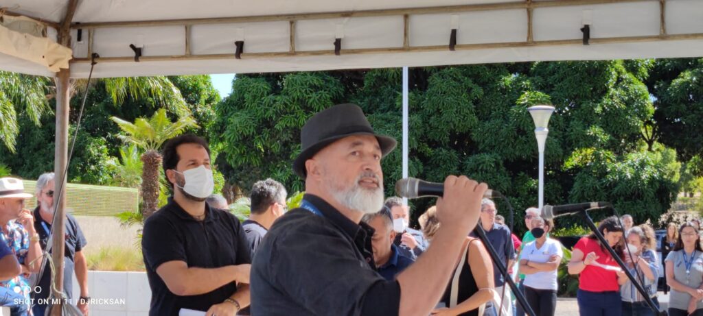 Enilson Plattner é diretor da Federação dos Bancários do Centro Norte (Fetec-CUT/CN) e empregado da Caixa há mais de 30 anos. Durante sua fala na atividade, o dirigente lembrou das diversas manifestações e momentos históricos já vividos no pátio que dá acesso ao Matriz I. “Da assembleia para a jornada de 6h ao ato recente de coragem das mulheres nos escandalosos casos de assédios da gestão de Pedro Guimarães, este pátio foi palco de luta e de resistência. Não podemos mais usá-lo para o luto”, frisou Enilson.