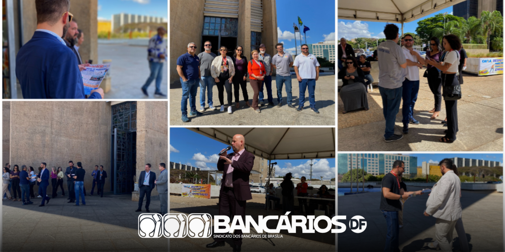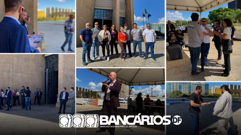 O Sindicato promoveu nesta quarta-feira (3) um ato de lançamento da Campanha Nacional dos Bancários 2024, em frente ao edifício Matriz I da Caixa, para convocação da categoria à mobilização e à participação no processo de renovação do Acordo Coletivo de Trabalho (ACT) das empregadas e empregados do banco.