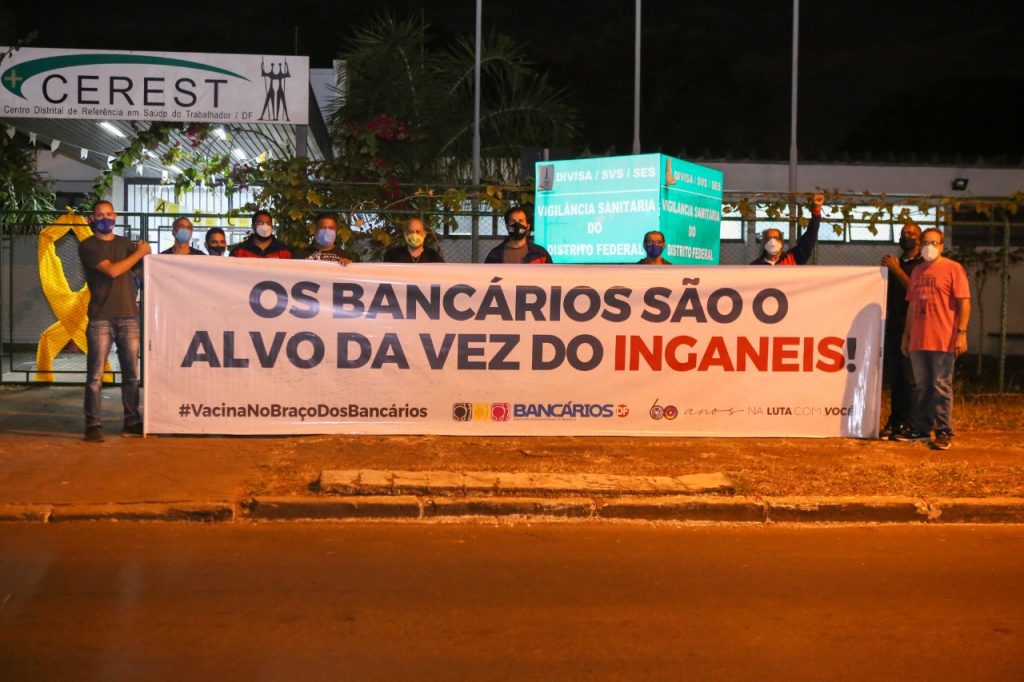 Com a ameaça de não inclusão dos bancários e bancárias na prioridade de vacinação, o Sindicato realizou um ato relâmpago nesta quinta-feira (15), às 18h, em frente à Secretaria de Saúde do DF, na 712 Sul, exigindo compromisso e transparência do Governo do DF. “Estranhamos esse silêncio do governo do DF. E realizamos esse ato pra evitar mais uma vez injustiça à categoria”, protestou o presidente do Sindicato, Kleytton Morais, ao cobrar um posicionamento do GDF.