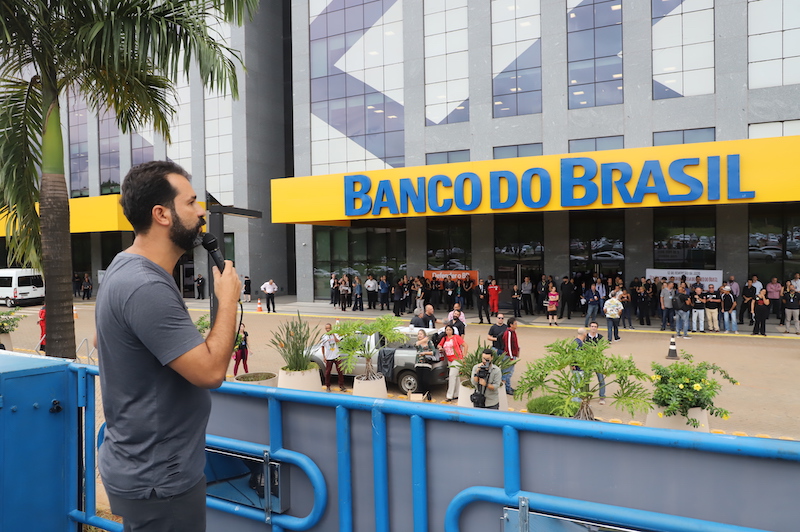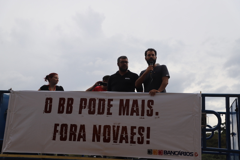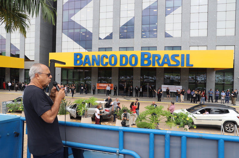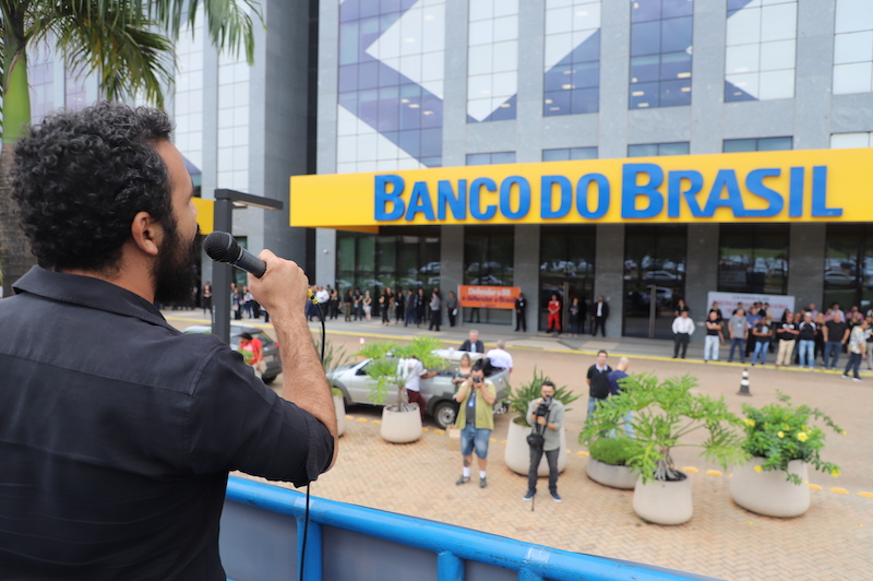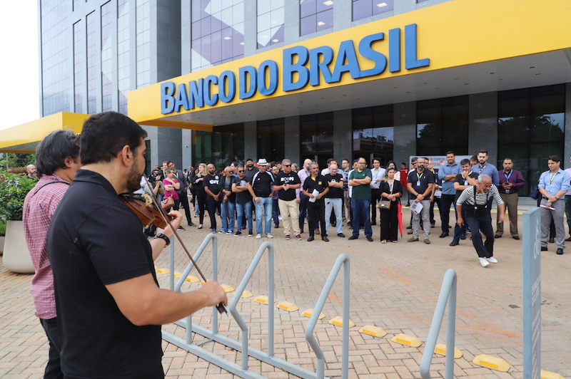 Durante o ato, o artista Miquéias Paz fez uma apresentação satirizando o dia a dia de um bancário, que precisa lidar com metas abusivas, jornadas excessivas e estresse. E os bancários e bancárias presentes entoaram gritos de guerra como “Um, dois, três, quatro, cinco, mil, todos em defesa do Banco do Brasil”, “O banco é do Brasil” e “O BB pode mais. Fora Rubens Novaes”.