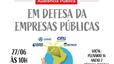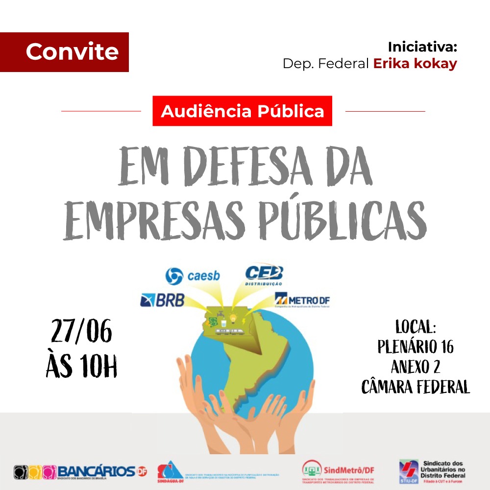 O Sindicato participará nesta quinta-feira (27) de uma audiência pública, na Câmara Federal, às 10h, no Plenário 16 do anexo 2, em defesa das empresas públicas do DF. No encontro será discutida a intenção do Governo do Distrito Federal (GDF) de privatizar as empresas estatais locais, como o BRB, CEB, Caesb e Metrô. A autora do requerimento é a deputada federal Erika Kokay (PT).