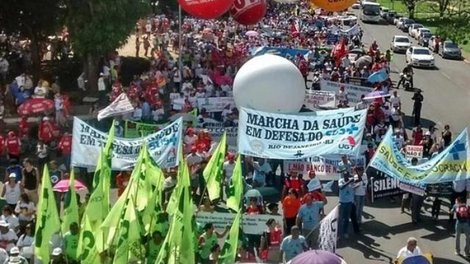 Milhares de manifestantes, vindos de todo o país, protestaram na tarde desta terça-feira (1º) na Esplanada dos Ministérios, em Brasília, em defesa do Sistema Único de Saúde (SUS), do ingresso de servidores apenas por meio de concurso e da não-privatização dos serviços do setor.