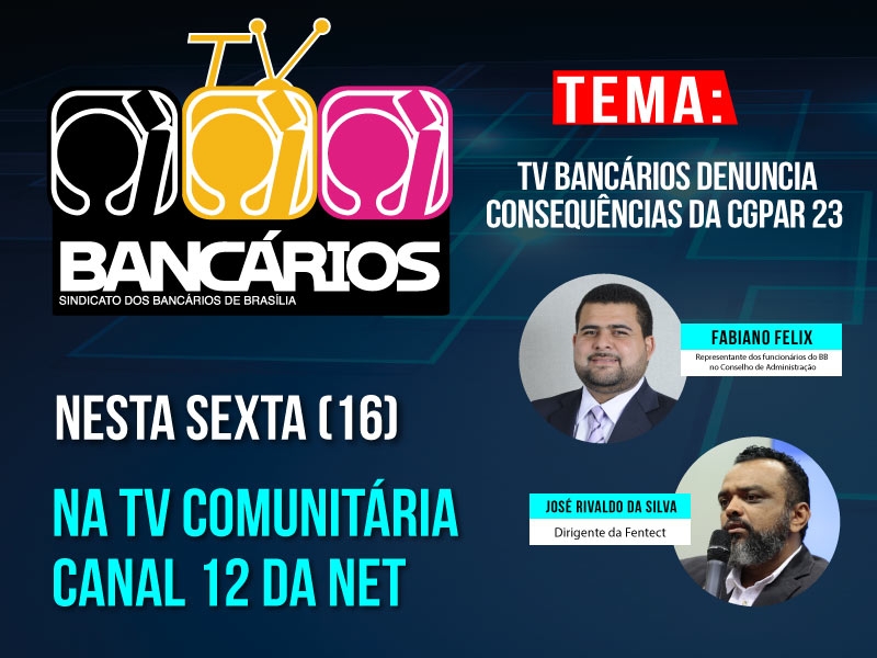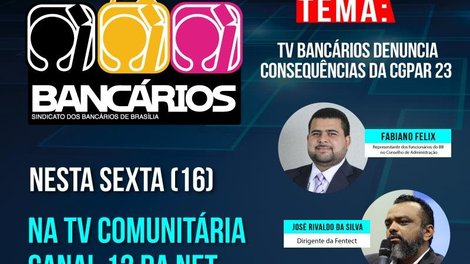 O TV Bancários na TV Comunitária desta semana contou com edição especial denunciando as consequências da Resolução CGPAR 23. Mediado pelo diretor do Sindicato Kleytton Morais, o programa recebeu como convidados Fabiano Felix, representante dos funcionários do BB no Conselho de Administração do banco, e José Rivaldo da Silva, dirigente da Federação Nacional dos Trabalhadores em Empresas de Correios e Telégrafos e Similares (Fentect).