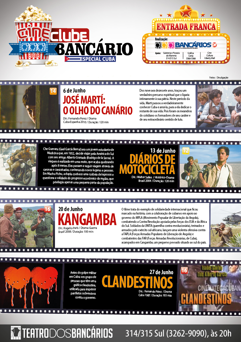 O Cineclube Bancário retoma suas atividades em 2016 com uma programação especial. Em junho, Cuba será homenageada com a exibição de quatro longas-metragens, cujos enredos apresentam a luta de ícones do povo cubano e a influência do país na história de outras nações.