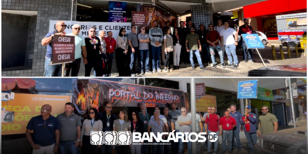 O Sindicato fez mais um ato de protesto contra as arbitrariedades praticadas pelos bancos privados, nesta quarta-feira (19), desta vez em frente as agências do Bradesco e do Itaú do Núcleo Bandeirante. E instalou novamente uma arte figurativa intitulada “Portal dos Infernos”, que faz parte dessa campanha de denúncia, na porta de entrada das unidades, para mostrar à população a real situação vivenciada pelos bancários.