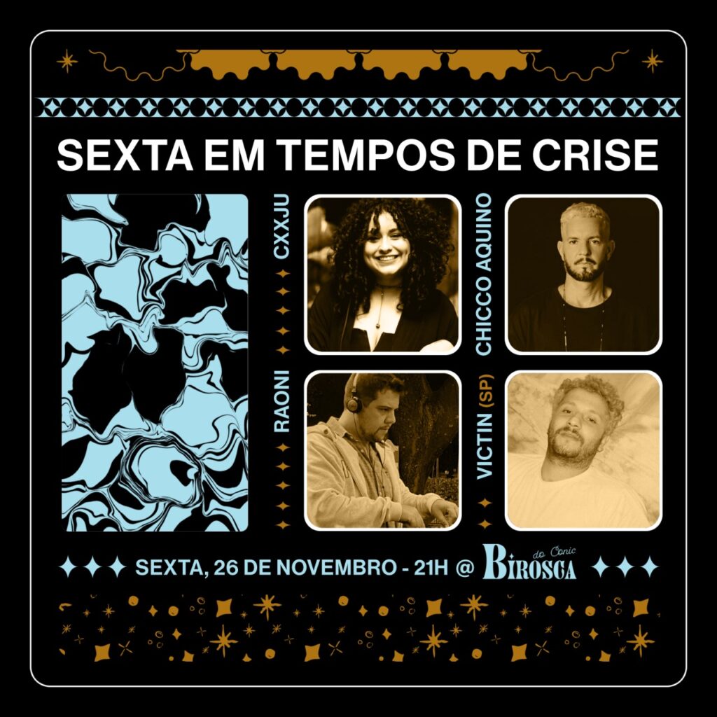 -- Sexta em tempos de crise, às 21h, no Birosca (SDS Bloco E, loja 3 – Conic), com DJs Victin, Raoni, Cxxju e Chicco Aquino.