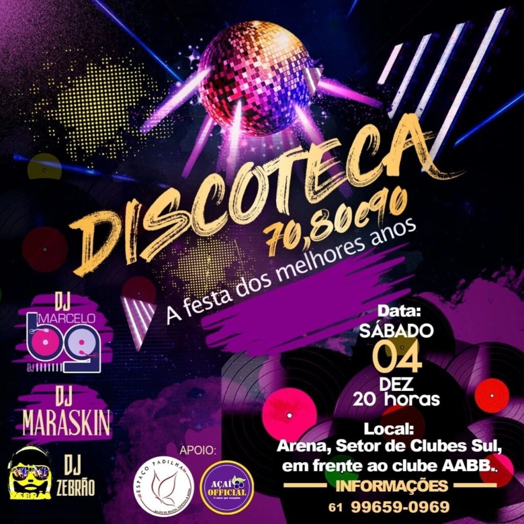 -- Discoteca, às 20h, na Arena Futebol Clube (Setor de Clubes Sul - em frente à AABB). O som dos anos 70, 80 e 90 com os DJs Marcelo BG, Maraskin e Zebrão.