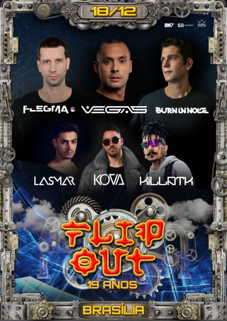-- Flip Out 19 anos, às 14h, no Bosque do Mané (Estádio Nacional Mané Garrincha). Festa de Música Eletrônica - DJ Vegas e amigos.