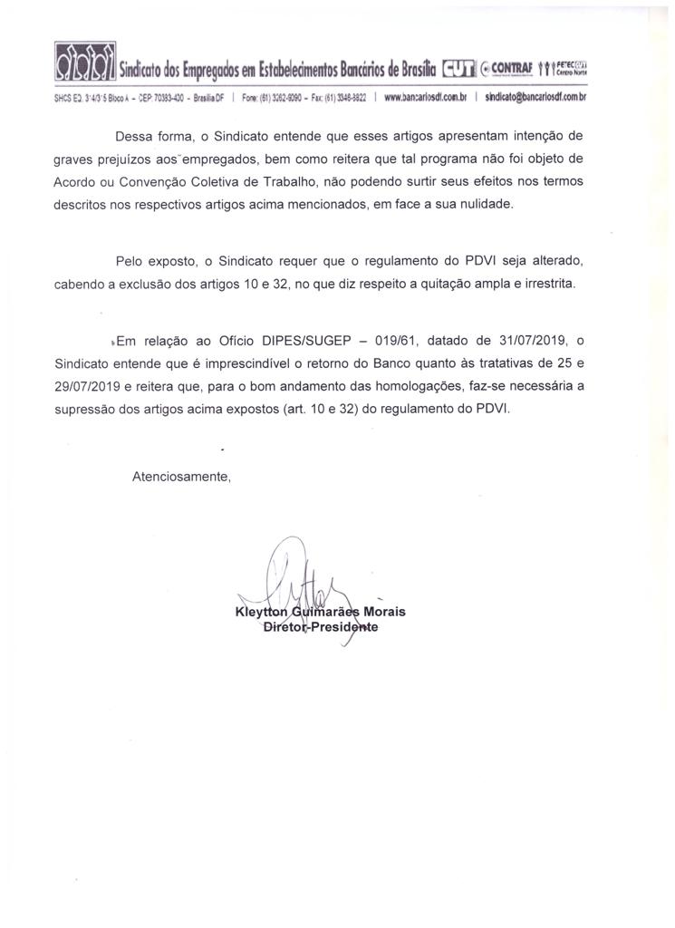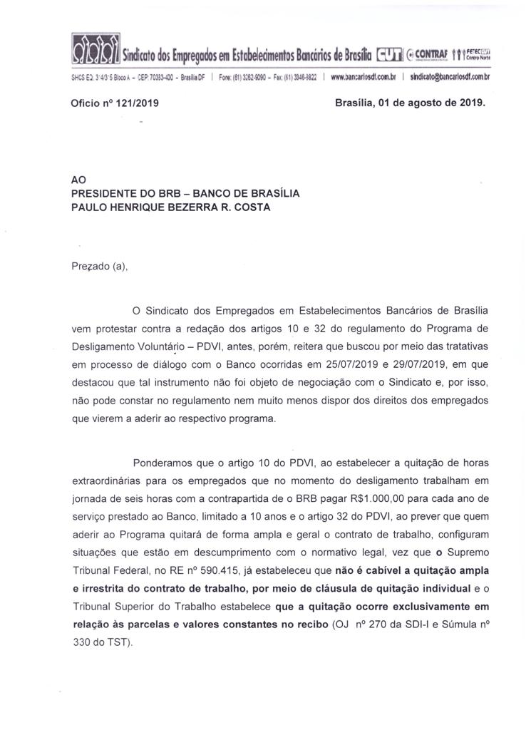 Sem resposta relativa ao questionamento de itens do PDVI que apresentam intenção de graves prejuízos aos empregados do BRB, o Sindicato protestou em ofício dirigido ao banco nesta quinta-feira (1º).