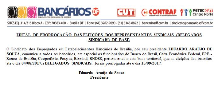 As eleições dos inscritos até o dia 4 foram prorrogadas até o dia 15 de setembro, conforme edital a seguir: