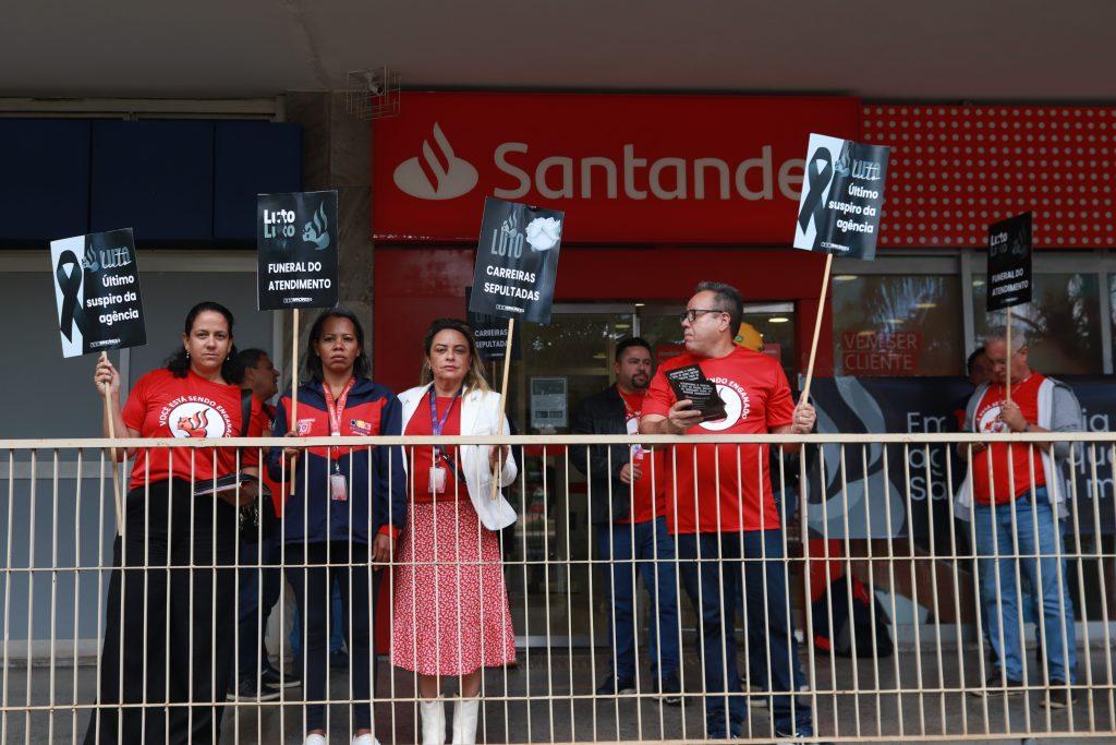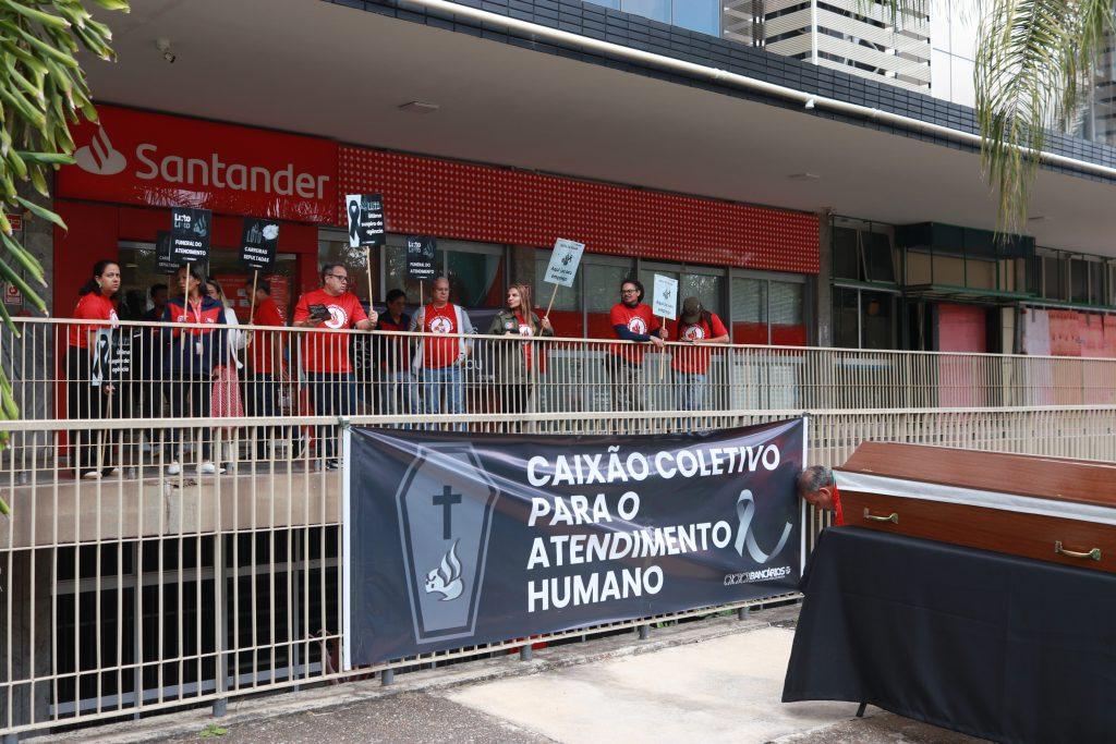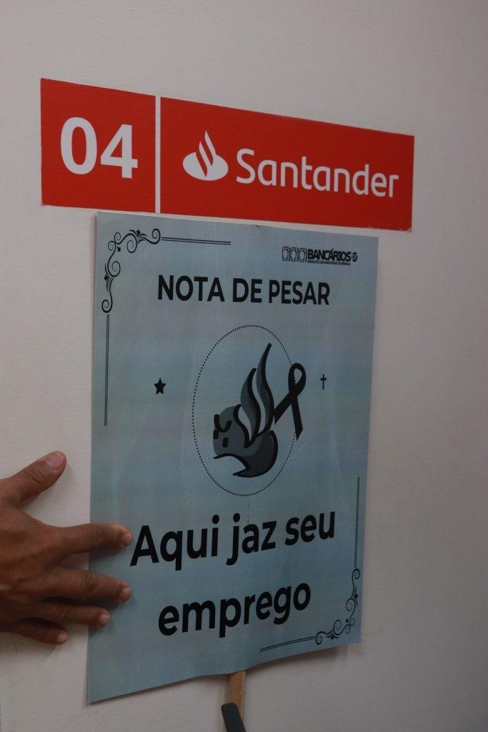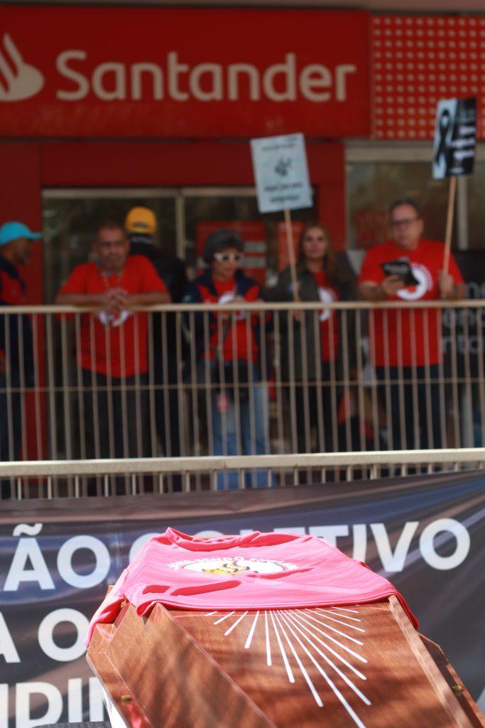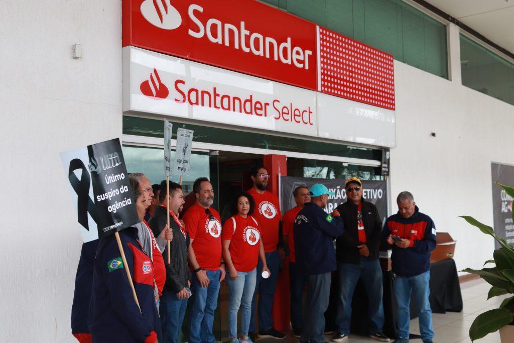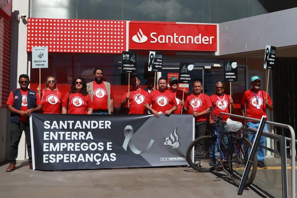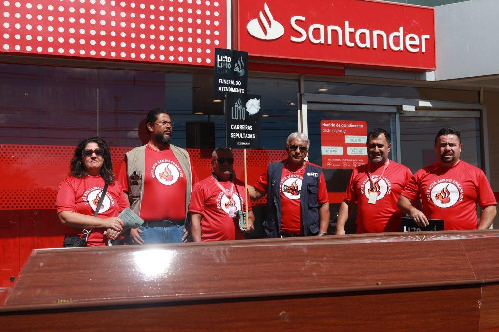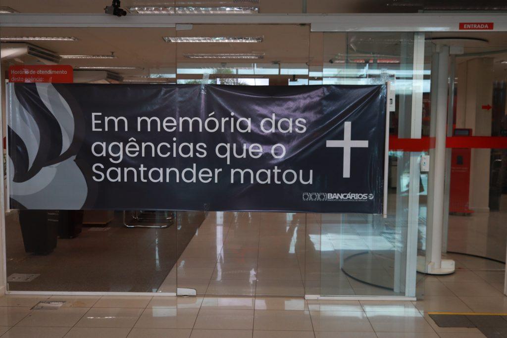 Por conta disso, o mote da mobilização foi “Luto nas agências do Santander – Eles querem enterrar quatro agências, mas quem sofre somos nós”, destacando os impactos profundos que essa política representa tanto para os trabalhadores quanto para os clientes.