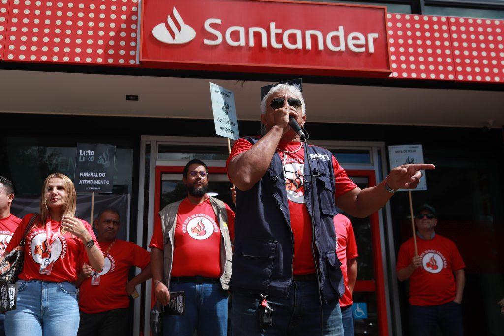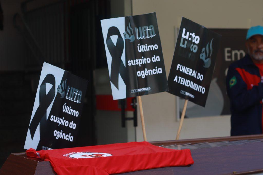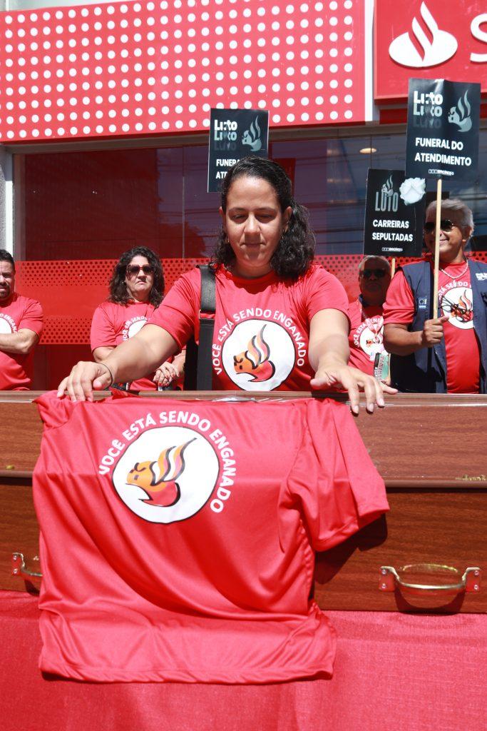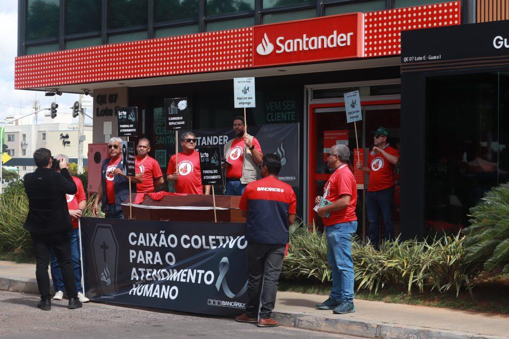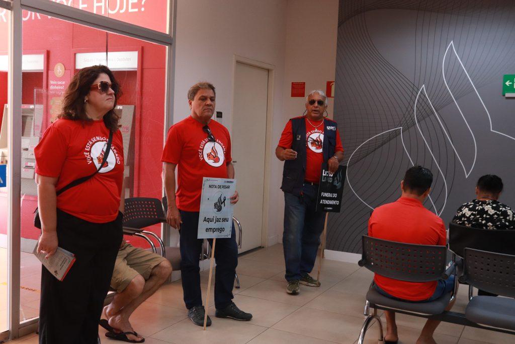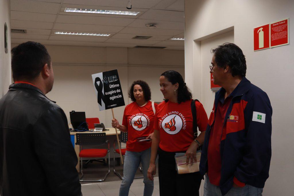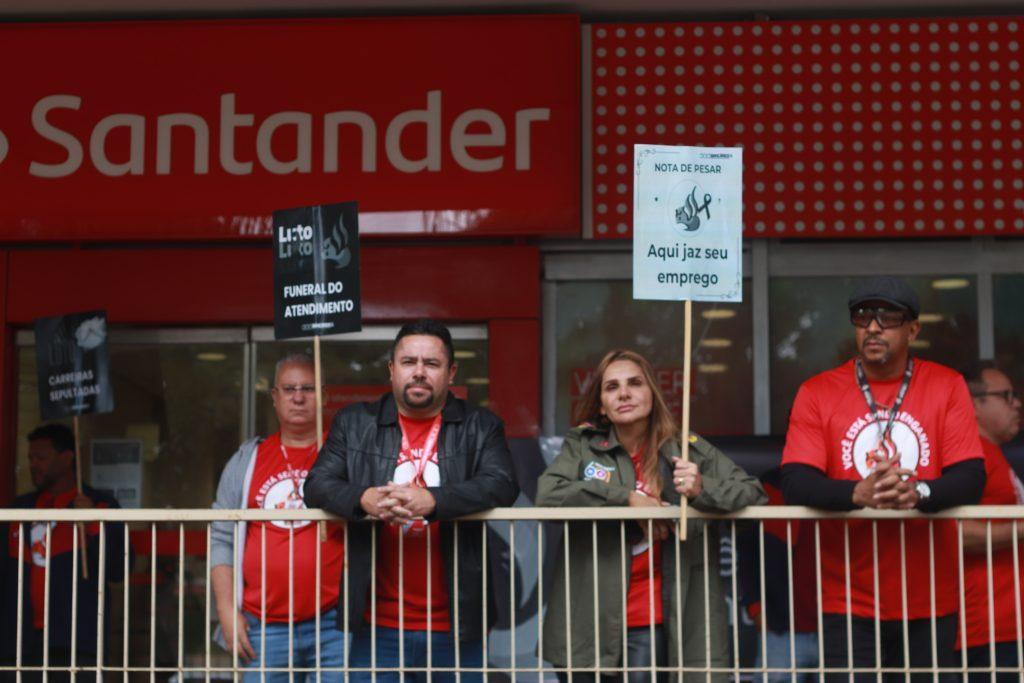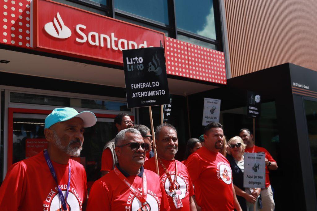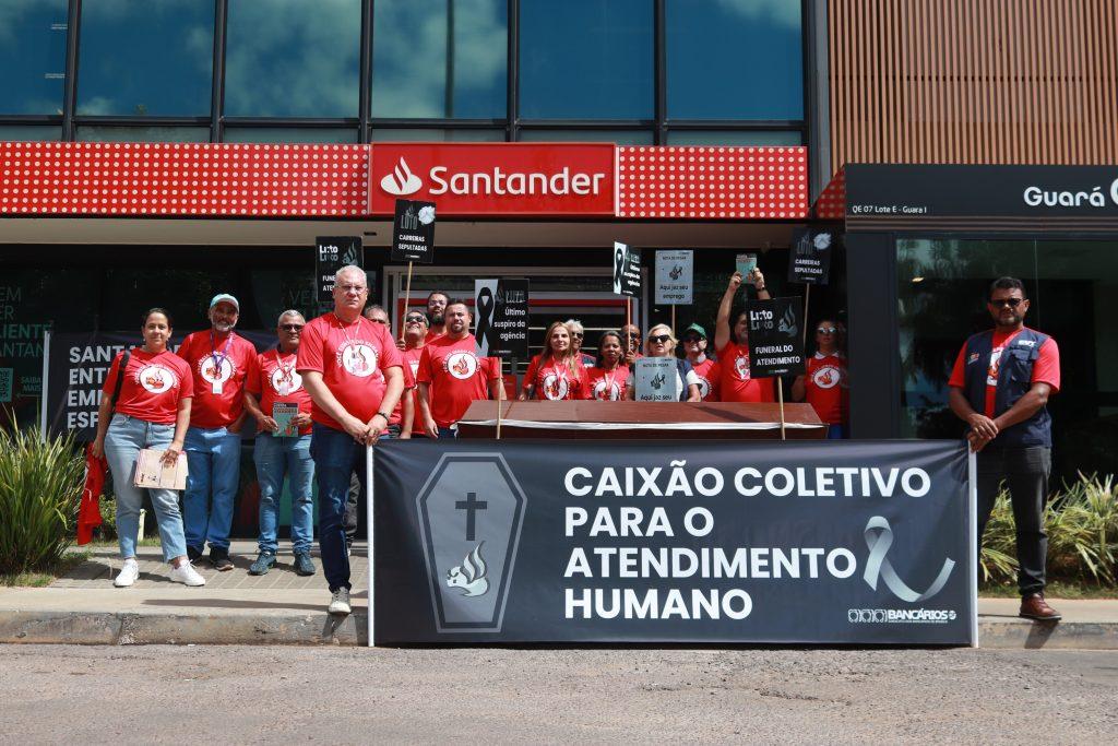 Por conta disso, o mote da mobilização foi “Luto nas agências do Santander – Eles querem enterrar quatro agências, mas quem sofre somos nós”, destacando os impactos profundos que essa política representa tanto para os trabalhadores quanto para os clientes.