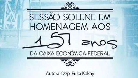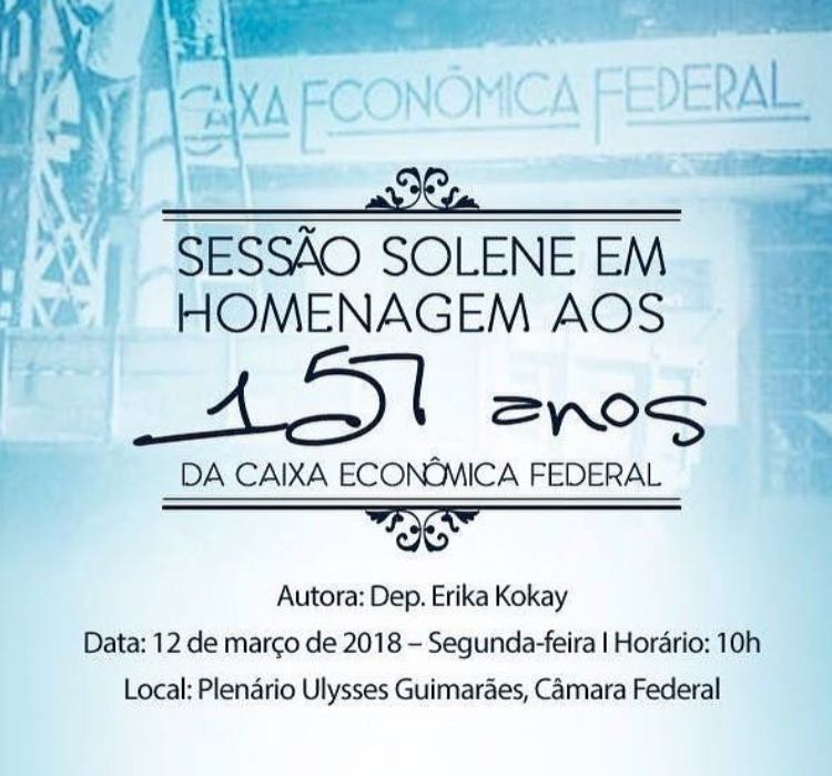 A Câmara Federal realiza sessão solene nesta segunda-feira (12) em homenagem aos 157 anos da Caixa Econômica Federal, completados no dia 12 de janeiro. A iniciativa, proposta pela deputada federal Erika Kokay (PT/DF), empregada do banco por 35 anos, terá início às 10h, no Plenário Ulysses Guimarães.