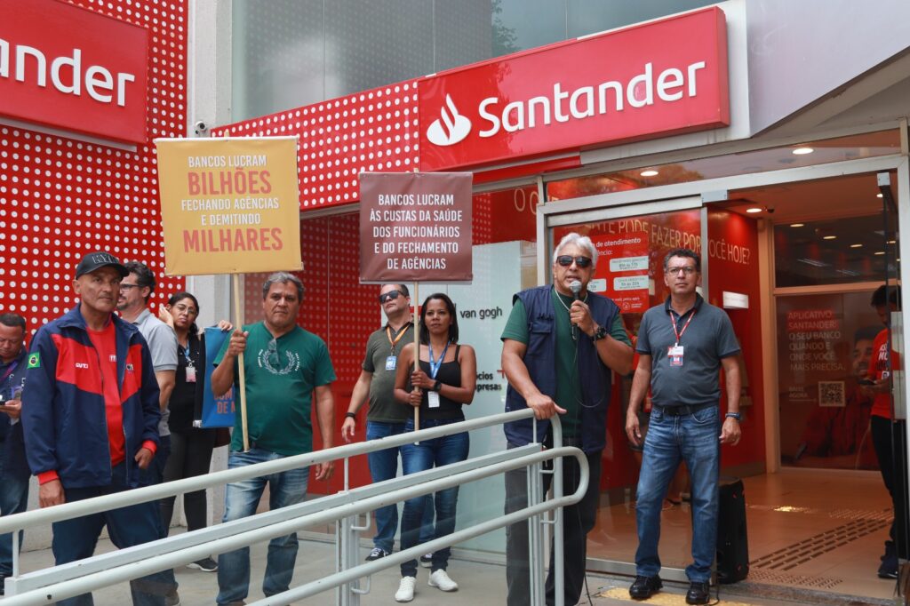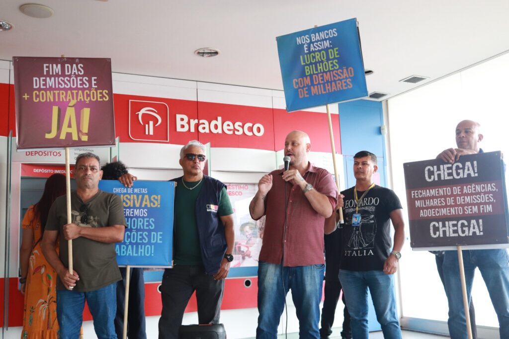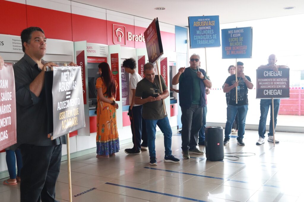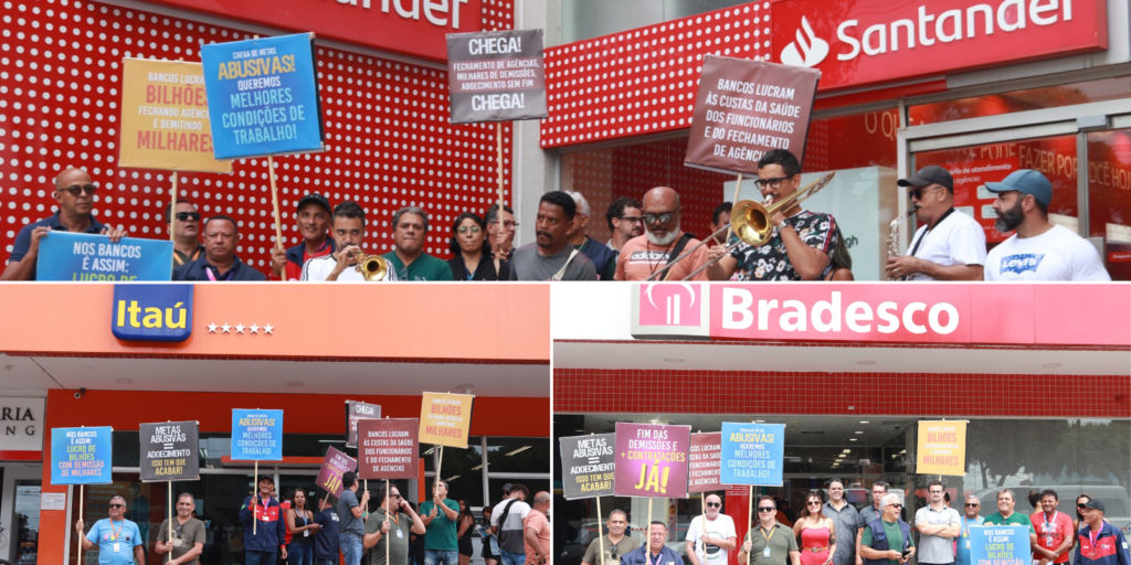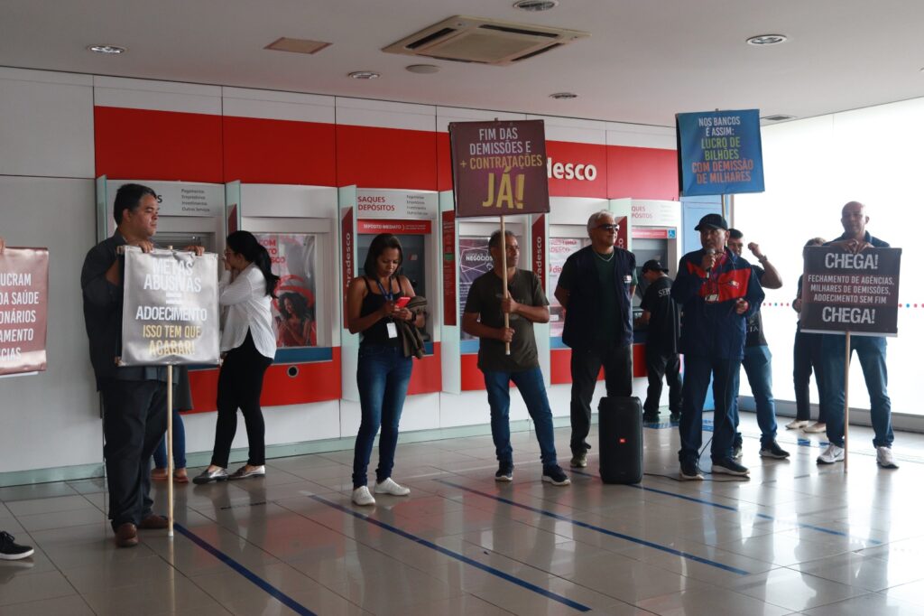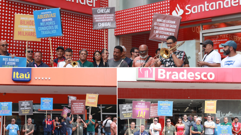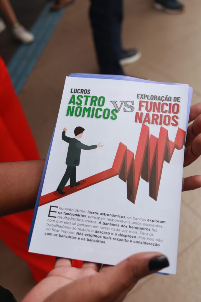 Na ocasião, os representantes dos bancários distribuíram um panfleto esclarecendo que, enquanto os banqueiros só se preocupam com os lucros exorbitantes, aos funcionários restam o descaso e o desprezo, com demissões injustificadas e sem reposição de trabalhadores, fechamento de agências, assédio moral com cobrança de metas abusivas, e adoecimento em função da sobrecarga de trabalho.
