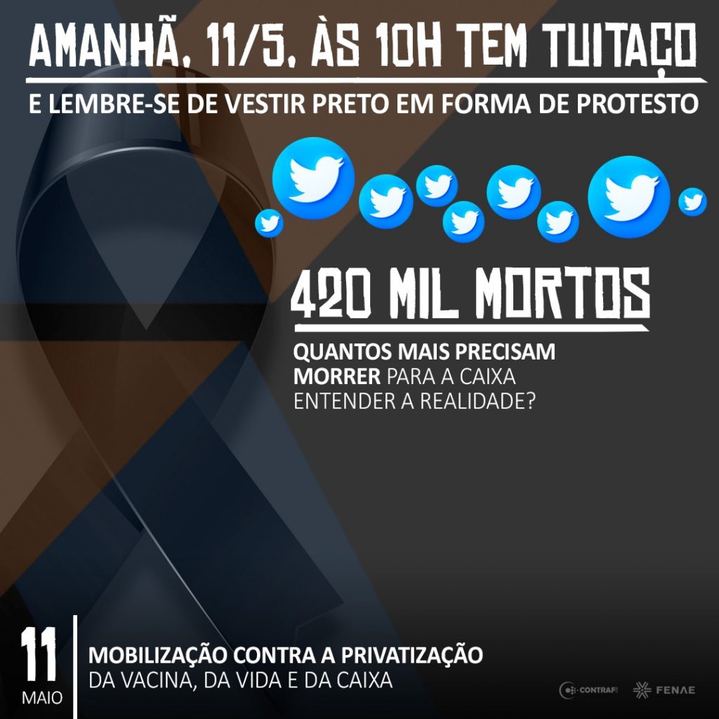 No dia de luto haverá um tuitaço, às 10h, e os bancários deverão vestir preto. Mobilize-se e participe deste ato utilizando nas suas redes as hashtags #EmpregadosCaixaEmLuto #LutoPelasVítimas #SomosMaisQueNúmeros #VacinaJá.