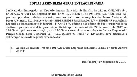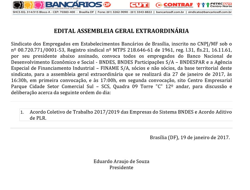 Estão convocados todos os empregados do sistema (BNDES, BNDESPAR e FINAME), sócios e não sócios, da base territorial deste sindicato.