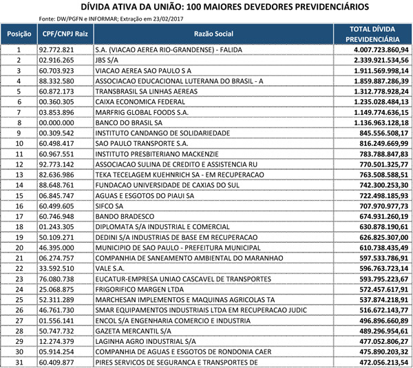 E o governo também divulgou as 100 empresas mais caloteiras do sistema. Entre as devedoras, destaques – todos negativos – para o Banco Bradesco (lucro de 15 bilhões em 2016), para empresas do governo federal, como o Banco do Brasil e da Caixa Econômica Federal, para a Volkswagen e para a empresa de serviços terceirizados Pires, que faz segurança e limpeza.