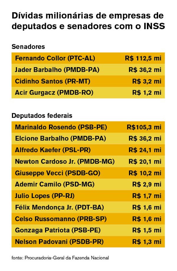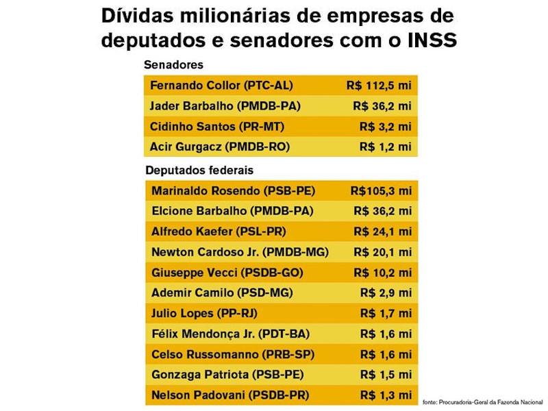 Enquanto debatem a Reforma da Previdência, deputados federais e senadores estão associados a empresas que devem R$ 372 milhões ao INSS. Segundo levantamento da Procuradoria-Geral da Fazenda Nacional, 73 deputados e 13 senadores estão ligados a grupos devedores da previdência – 1 em cada 7 congressistas.
