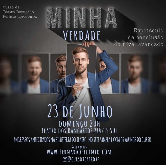 No domingo (23), será a vez da turma do nível avançado apresentar a peça de conclusão do Curso de Teatro Bernardo Felinto, A Minha Verdade, no Teatro dos Bancários, às 20h, para o público em geral.
