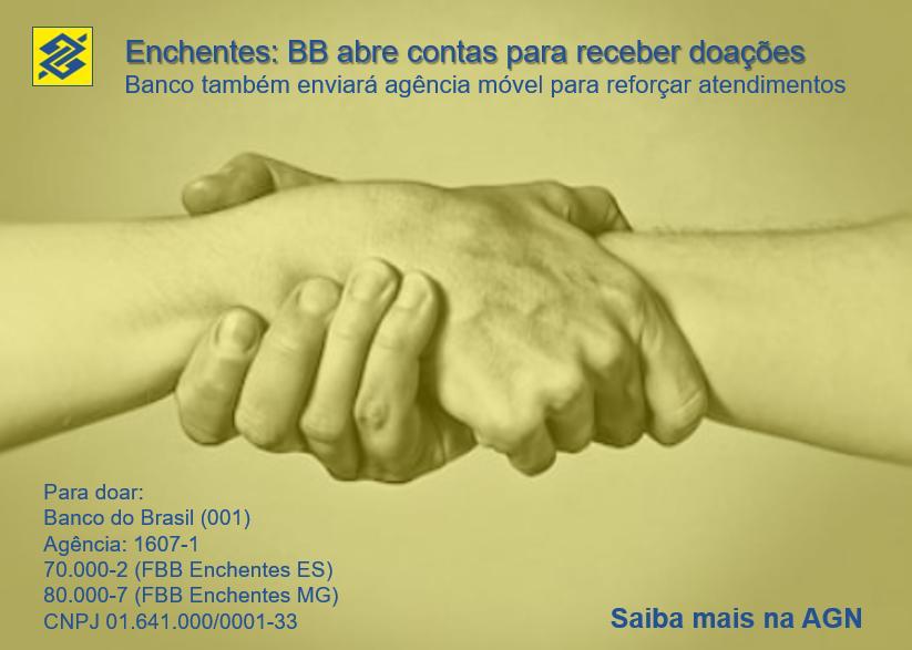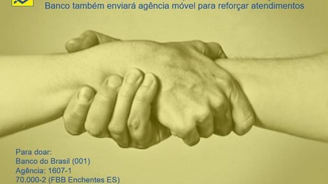 As populações dos estados do Espírito Santo e Minas Gerais estão sofrendo com a calamidade que se instalou nessas regiões após as últimas enchentes. Em solidariedade, a Fundação Banco do Brasil e seus funcionários estão recebendo doações voluntárias. O Sindicato apoia a ação solidária que ajudará sobremaneira os afetados pela força das águas.