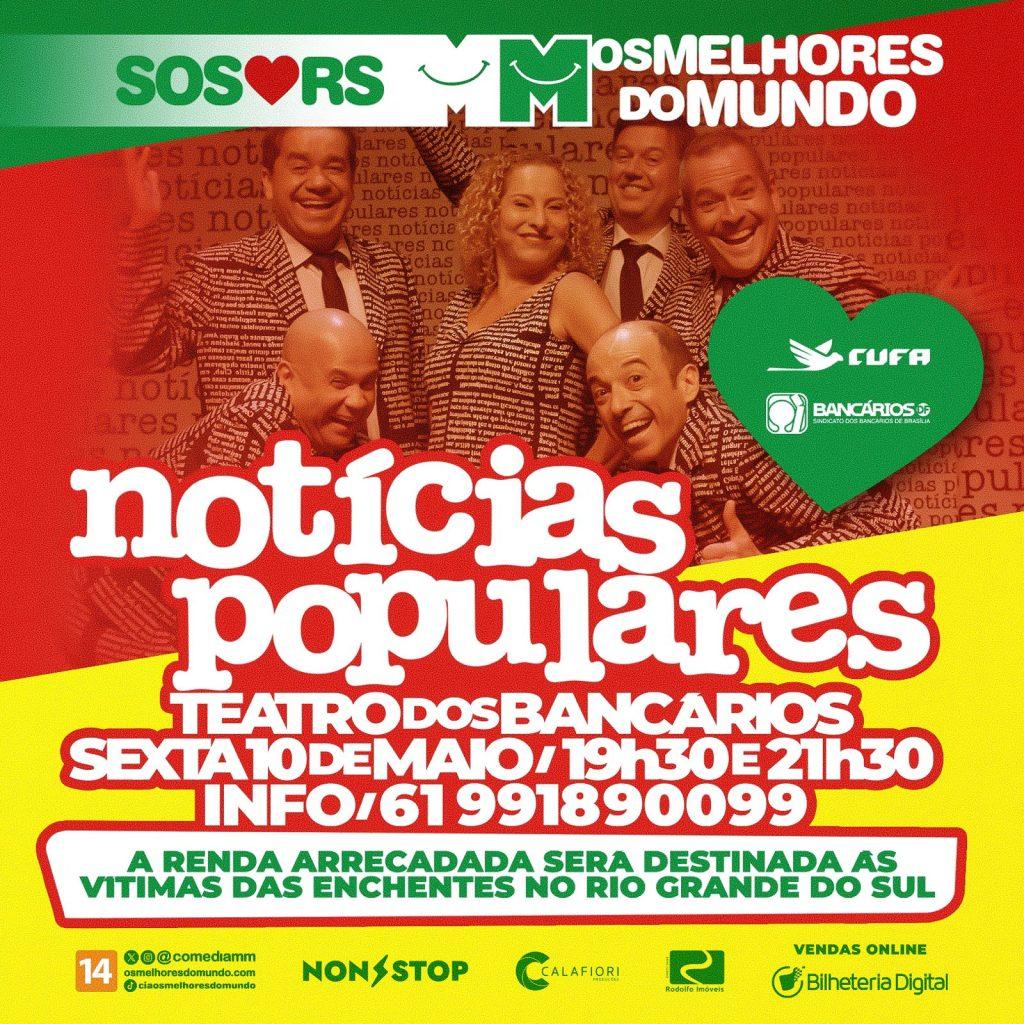 O Rio Grande do Sul sempre abraçou Os Melhores do Mundo. Chegou a hora de a gente retribuir todo esse carinho. Por isso, com o apoio do Sindicato, o grupo de teatro brasiliense promove nesta sexta-feira, dia 10, duas sessões da sua peça teatral Notícias Populares, no Teatro dos Bancários, com toda a renda revertida para as ações da CUFA (Central Única das Favelas) em prol das vítimas das enchentes no estado. As sessões serão às 19h30 e 21h, e os ingressos podem ser adquiridos em www.bilheteriadigital.com/melhoresdomundo.