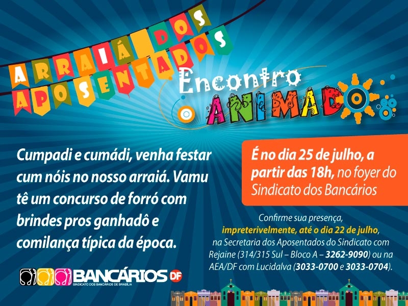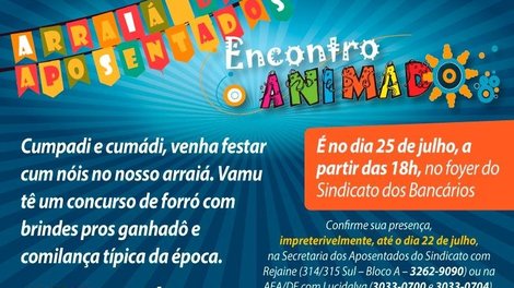 A próxima edição do Encontro Animado promete agitar os bancários aposentados. Na terça-feira 25, a partir das 18h, é vez da folia julina com o Arraiá dos Aposentados. O evento será na sede do Sindicato (EQS 314/315) e contará com concurso de forró e muita comida típica.