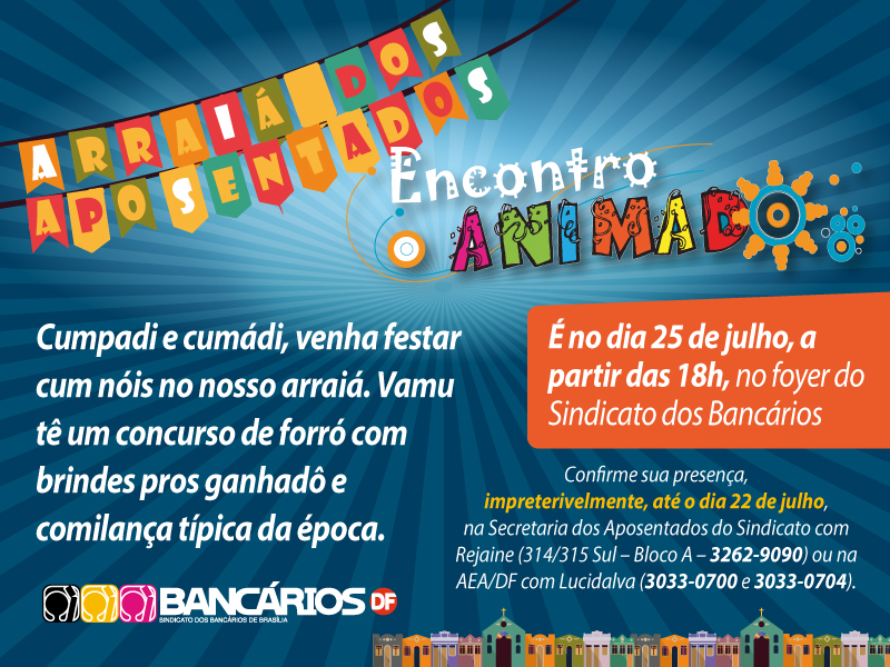 Para participar do Arraiá, basta confirmar presença até 22 de julho na Secretaria dos Aposentados do Sindicato (3262-9090, falar com Rejaine) ou na Associação dos Economiários Aposentados de Brasília (AEA-DF) pelos telefones 3033-0700 ou 3033-0704 (falar com Lucidalva).