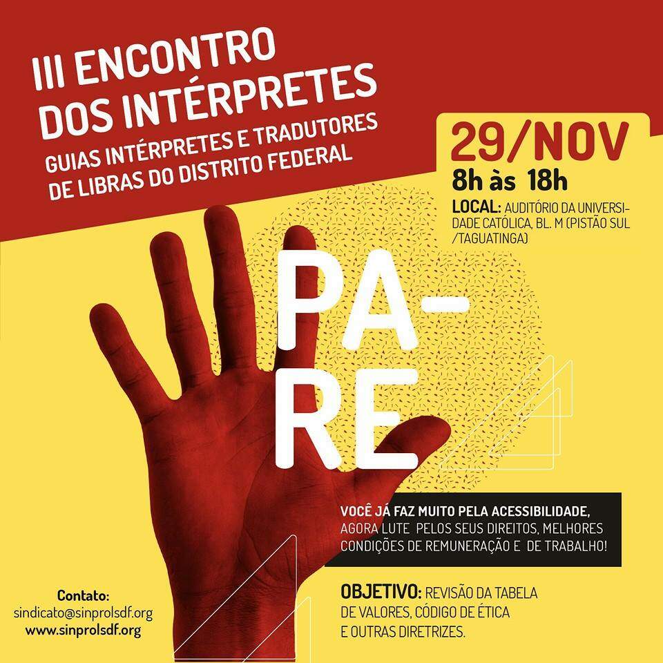 O 3º Encontro dos Interpretes, Guia interprete e Tradutores de Libras do Distrito Federal debaterá as diretrizes de lutas da categoria para os próximos dois anos, além da atualização da tabela de valores para os trabalhadores freelancers e a elaboração do novo código de ética da categoria. O Encontro ocorrerá no próximo sábado (29), das 8h às 18h no auditório do bloco M da Universidade Católica de Brasília – UCB, no Pistão Sul, em Taguatinga.