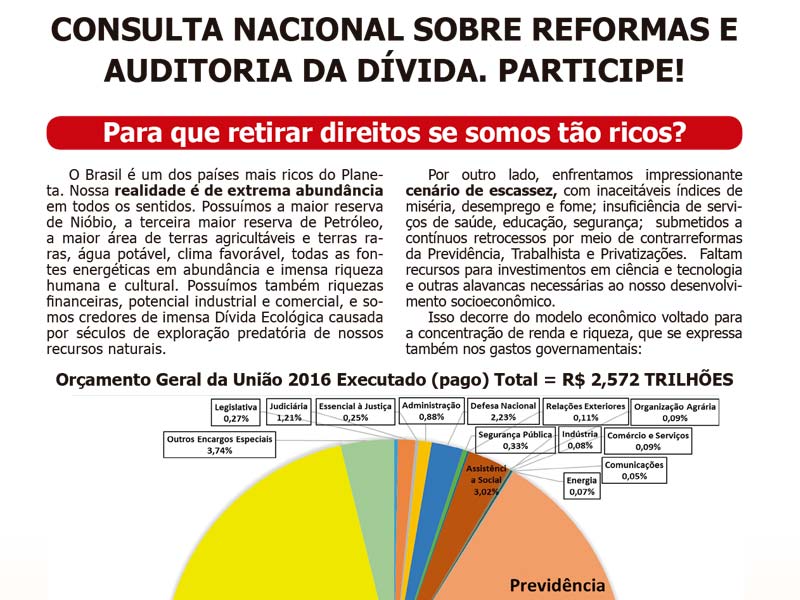 Para que retirar direitos, se Brasil é um dos países mais ricos do Planeta? Deste questionamento, nasce a Consulta Nacional sobre Reformas e Auditoria da Dívida. Criada por diversas entidades sindicais e sociais, a campanha vai ouvir a população até o dia 30 de junho. Entre os temas, reformas previdenciária e trabalhista, privatizações, terceirização e auditoria da dívida pública.