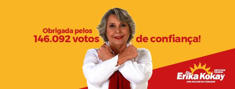 A bancária da Caixa Erika Kokay (PT) foi reeleita em 2 de outubro para o seu terceiro mandato na Câmara Federal com 146.092 votos (9,06% dos votos válidos), alcançando a terceira posição entre os oito deputados federais eleitos pelo Distrito Federal.