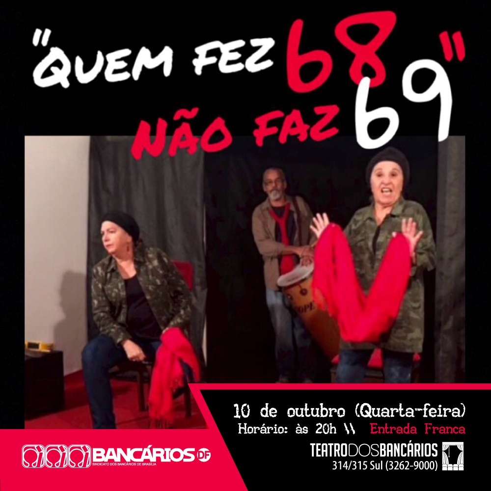 “Quem fez 68 não faz 69” é atração no Teatro dos Bancários, no dia 10 de outubro (uma quarta-feira), às 20h. Com uma dramaturgia dinâmica, bem humorada, construída por depoimentos de personagens militantes, a peça tem texto de Ricardo Guilherme, atuação e direção de Ruth Guimarães e Sérgio Viana, e participação especial de Fátima Lacerda.
