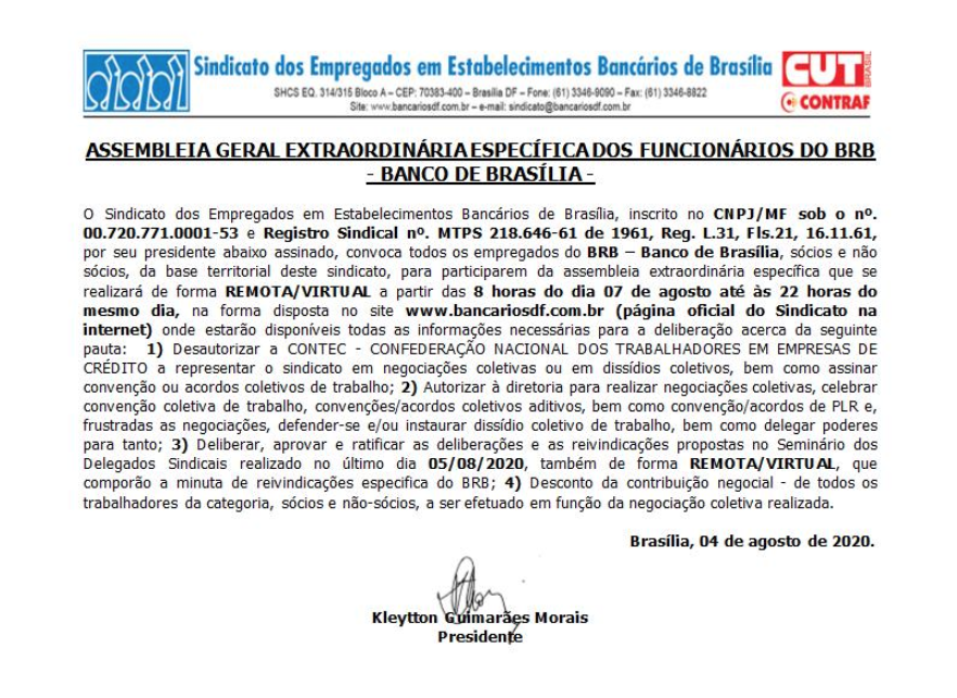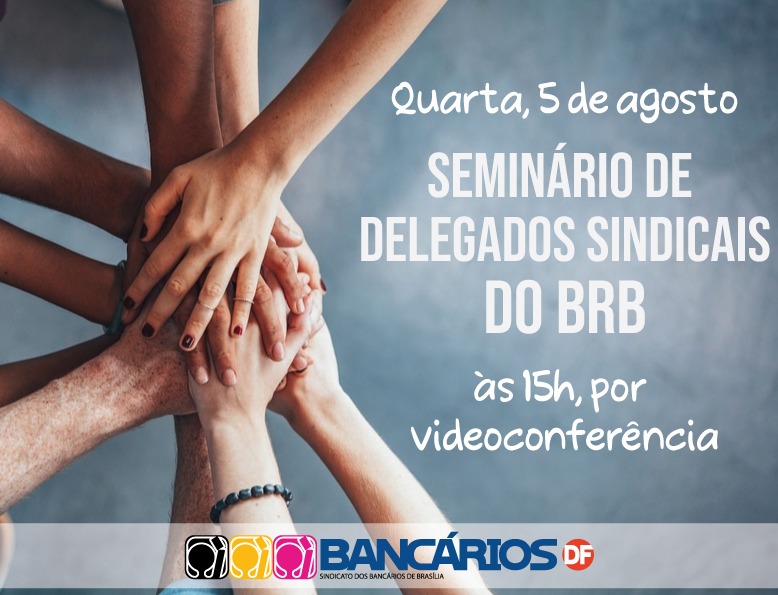 Neste dia 05 de agosto, dando continuidade à campanha salarial do BRB, os delegados sindicais estão convocados para participarem de seminário em que, dentre outras coisas, discutiremos uma pauta específica para as negociações com o banco. O Seminário terá início às 15 horas e ocorrerá por videoconferência. Visando a receber contribuições para a formatação da pauta que será definida no seminário, o Sindicado dos Bancários disponibiliza um espaço em seu site para todos os bancários do BRB poderem se manifestar, com o link no corpo dessa matéria.