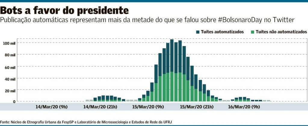 A pesquisa identificou a ação de 23,5 mil usuários não humanos a favor do presidente em um universo total de 66 mil usuários que publicaram a “hashtag” naquele dia, fazendo com que o #BolsonaroDay fosse para os Trending Topics mundiais do Twitter, indicação de assunto entre os dez mais falados no globo.