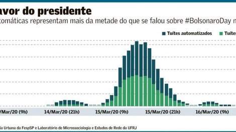 A pesquisa identificou a ação de 23,5 mil usuários não humanos a favor do presidente em um universo total de 66 mil usuários que publicaram a “hashtag” naquele dia, fazendo com que o #BolsonaroDay fosse para os Trending Topics mundiais do Twitter, indicação de assunto entre os dez mais falados no globo.