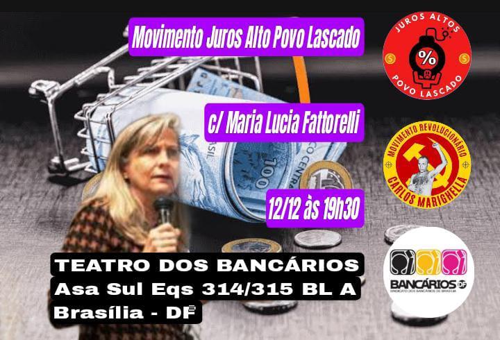 Nesta quinta (12), às 19h30, o Movimento Juros Altos, Povo Lascado promove uma palestra com Maria Lúcia Fatorelli, que vai falar sobre a dívida pública brasileira e a necessidade de uma auditoria cidadã.