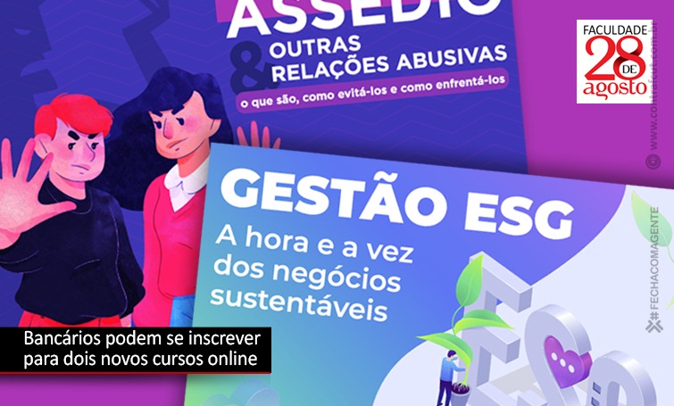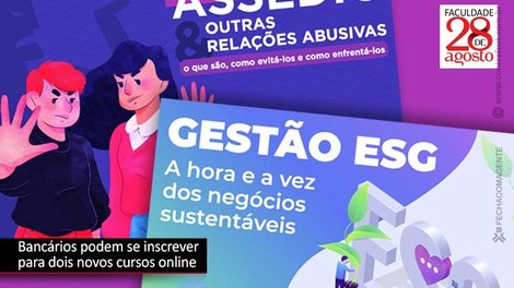 A Faculdade 28 de Agosto, em parceria com o Sindicato dos Bancários e Financiários de São Paulo, Osasco e Região, lançou dois cursos online – ‘Gestão ESG: A hora e a vez dos negócios sustentáveis’ e ‘Assédios & outras relações abusivas’. O público-alvo são os trabalhadores do sistema financeiro. Interessados devem se inscrever até o dia 14 de abril. Bancárias e bancários sindicalizados em Brasília têm desconto de 50% e pagam apenas R$ 100.