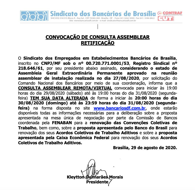 “Tão logo finalizarmos as negociações de hoje com a Fenaban, divulgaremos o conteúdo das propostas, promovendo debate e esclarecimento aos colegas”, explica o presidente Kleytton Morais. Ele finaliza reforçando a convocatória para que todos permaneçam atentos às divulgações do Sindicato e organizem-se para participar da reunião assemblear neste domingo (30), às 16h, em plataforma virtual, para apreciação e discussão das propostas. Já a votação será aberta às 20h pelo sistema Vota Bem e seguirá disponível para a manifestação dos bancários até às 23h59 de segunda-feira, 31 de agosto (veja edital abaixo).