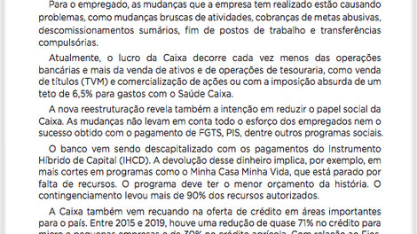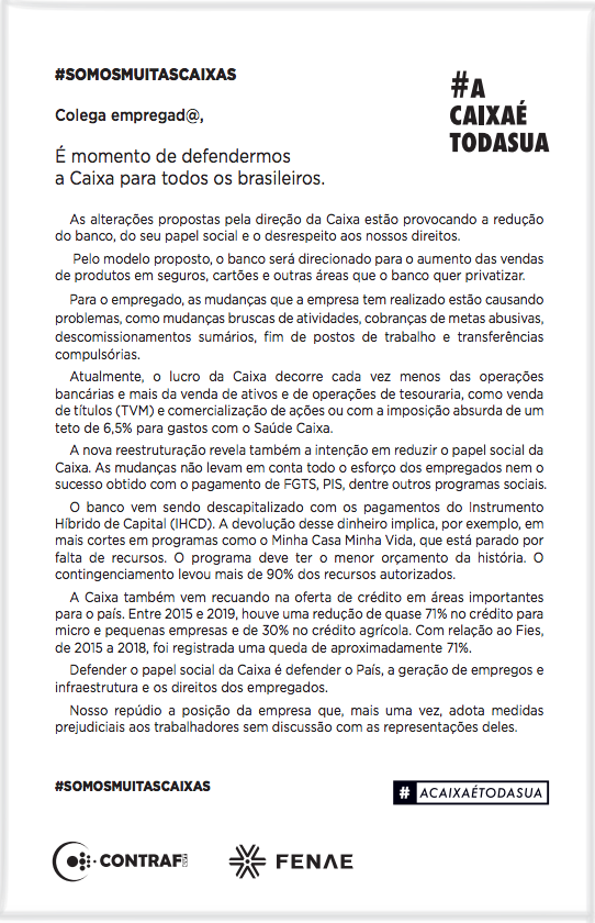 É momento de defendermos a Caixa para todos os brasileiros. É com essa convicção que a Fenae e a Contraf estão convocando os empregados da Caixa para a mobilização, em carta que será distribuída nas unidades e que chama a atenção sobre os pontos negativos da reestruturação, anunciada no dia 22 de fevereiro, e os ataques ao papel social do banco.