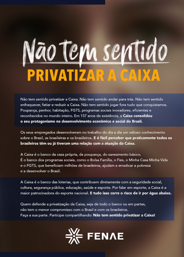 No manifesto de lançamento da campanha, a Fenae frisa que não tem sentido jogar fora conquistas importantes. “Poupança, penhor, habitação, FGTS, programas sociais inovadores, eficientes e reconhecidos no mundo inteiro. Em 157 anos de existência, a Caixa consolidou o seu protagonismo no desenvolvimento econômico e social do Brasil”, diz o texto. E ainda: “Quem defende a privatização da Caixa, seja de todo o banco ou seja em partes, não tem o menor compromisso com o Brasil e com os brasileiros”.