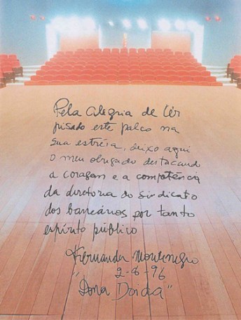 Matriarca da dramaturgia brasileira, Fernanda Montenegro, em 2 de agosto de 1996, nos deu a honra de inaugurar o Teatro dos Bancários, com a apresentação da peça “Dona Doida”, grande sucesso de público à época.